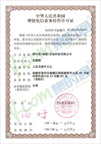 我司于2015年1月30日顺利获得由中华人民共和国工业和信息化部印制并颁发的《中华人民共和国增值电信业务经营许可证》,经营许可证编号:B1.B2-20150074。