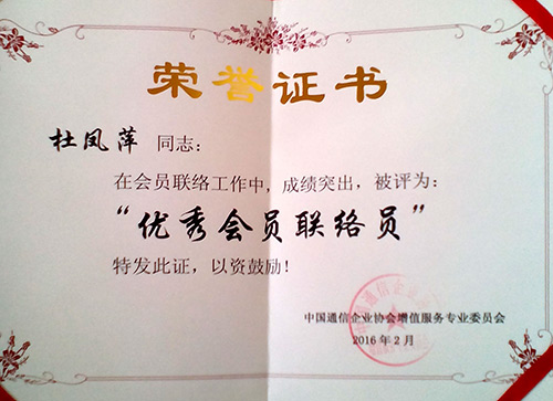 我司员工杜凤萍在与中国通信企业协会增值服务专业委员的会员联络工作中,成绩突出,被评选为2015年度优秀会员联络员。