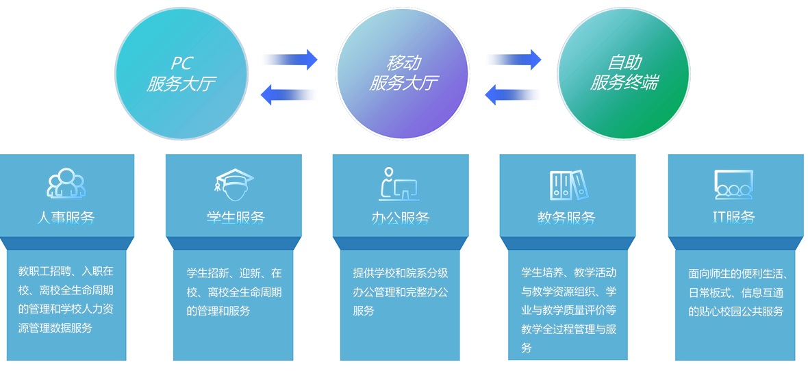 通过服务中心大厅信息化建设,实现人事、学生、办公、教务等自助业务功能,并通过升级综合管理后台,有效落实精细化管理手段,提升高校校管服务的质量和水平,进一步增强服务的智慧度,改善办事环境,提高办事效率。 |