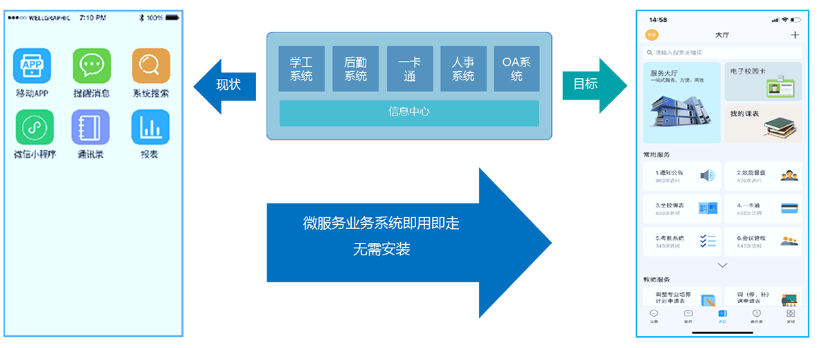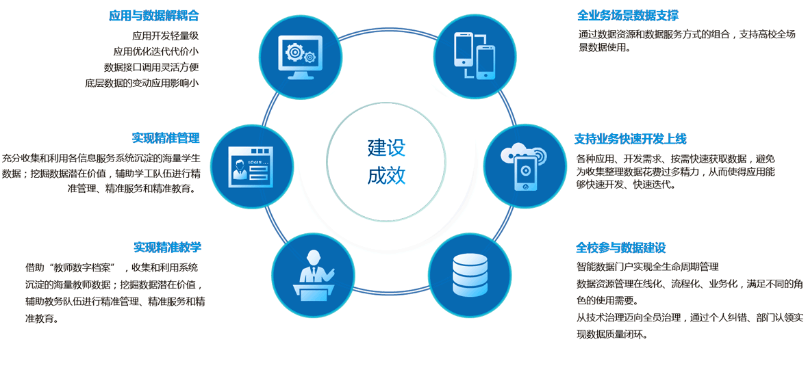 统一应用入口、汇聚全校信息, 让数据多跑路让师生少跑腿。强化数据应用,提升管理水平、突出整合展示、聚焦共建共享。 |